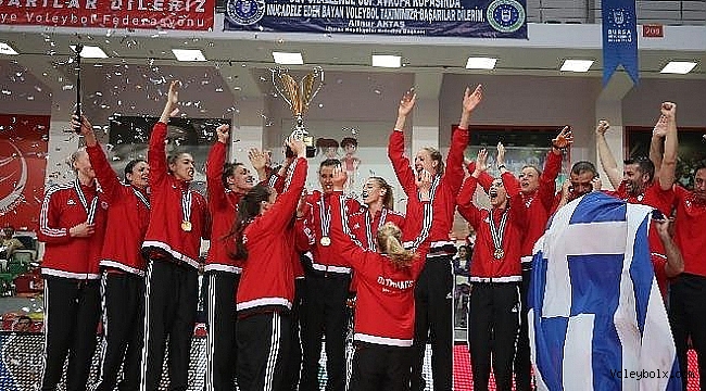 Kadınlar Challenge Kupası finalinde, ilk maçta sahasında 3-2 mağlup olduğu Bursa Büyükşehir Belediyespor'u deplasmandaki rövanş mücadelesinde 3-1 yenerek şampiyon olan Yunan ekibi Olympiakos, kupasını kaldırdı.