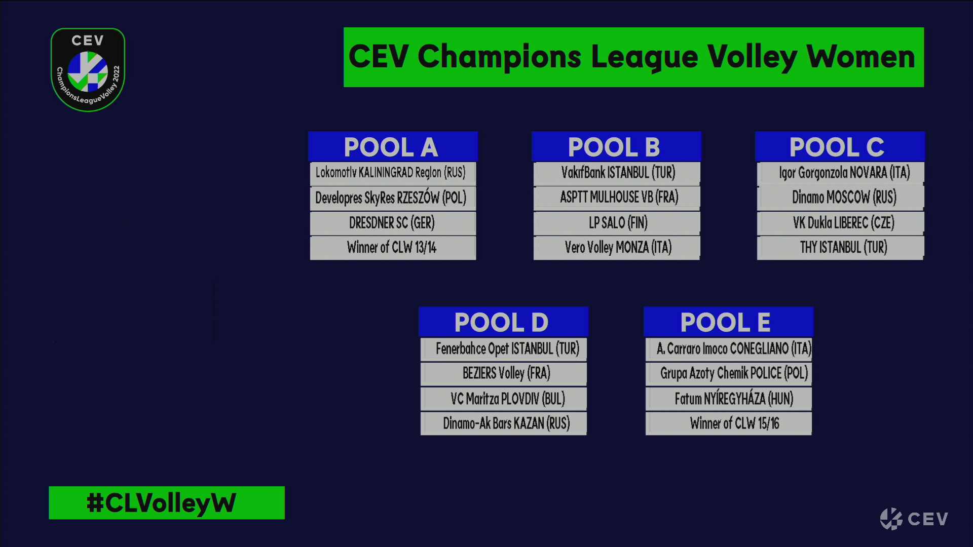 2022 CEV Şampiyonlar Ligi’nde ülkemizi temsil edecek ekiplerimizden kadınlarda; Fenerbahçe Opet, VakıfBank ve Türk Hava Yolları, erkeklerde; Fenerbahçe HDI Sigorta ve Ziraat Bankkart’ın grup aşamasındaki rakipleri belli oldu.Slovenya’nın başkenti Ljubljana’da gerçekleşen kura çekimiyle belli oldu.Kadınlar kategorisindeki temsilcilerimizden VakıfBank, B Grubu’nda Fransa’dan ASPTT Mulhouse, Finlandiya’dan LP Salo ve İtalya’dan Vero Volley Monza ile eşleşti. D Grubu’nda Fenerbahçe Opet ise Fransa’dan Beziers Volley, Bulgaristan’dan Maritza Plovdiv ve Rusya’dan Dinamo-Ak Bars Kazan ile eşleşti. Türk Hava Yolları da C Grubu’nda İtalya’dan Igor Gorgonzola Novara, Rusya’dan Dinamo Moskova ve Çekya’dan VK Dubla Liberec takımları ile eşleşti.Erkekler kategorisindeki temsilcilerimizden Fenerbahçe HDI Sigorta, E Grubu’nda İtalya’dan Sir Sicoma Monini Perugia ile Trentino Itas ve Fransa’dan AS Cannes Dragons ile eşleşti. B Grubu’nda yer alan Ziraat Bankkart ise Rusya’dan Dinamo Moskova, Belçika’dan VC Greenyard Maaseik ve Polonya’dan Projekt Warszawa ile eşleşti.